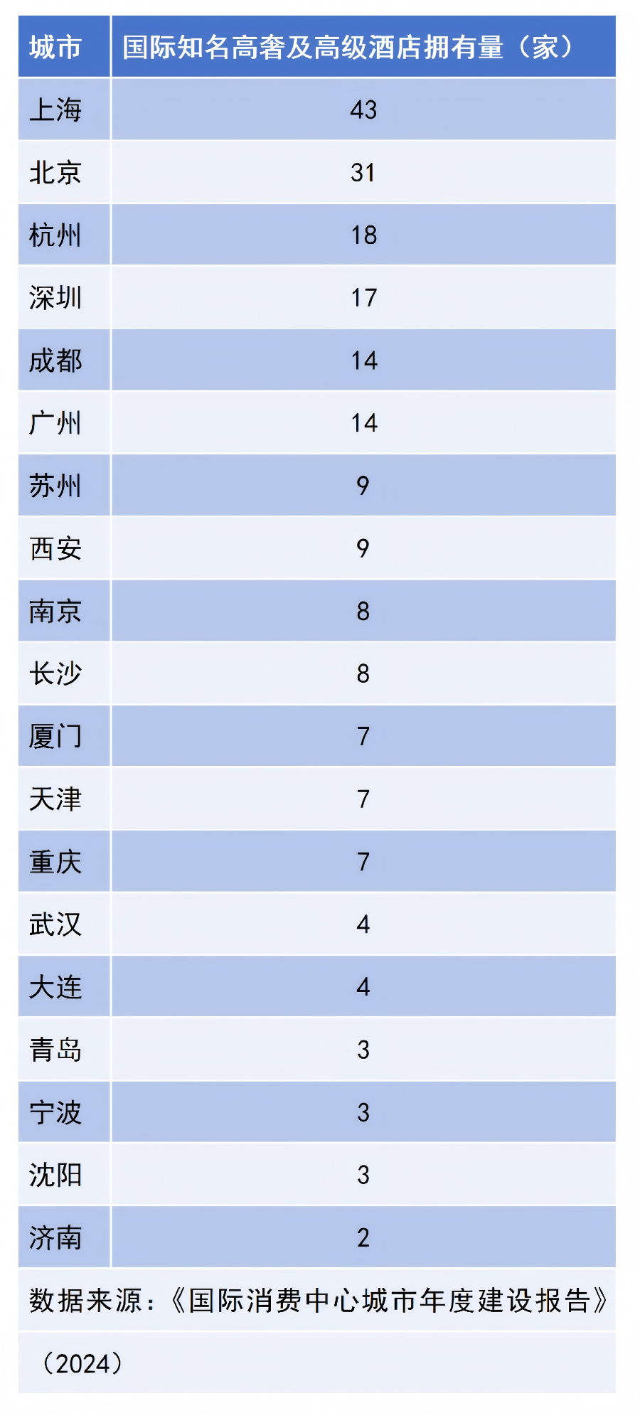 2024年,21世纪经济研究院与仲量联行联合发布的《国际消费中心城市年度建设报告》中,也将高等级酒店的数量纳入评价范围,认为这是衡量一座城市在“国际吸引力”上的重要指标。