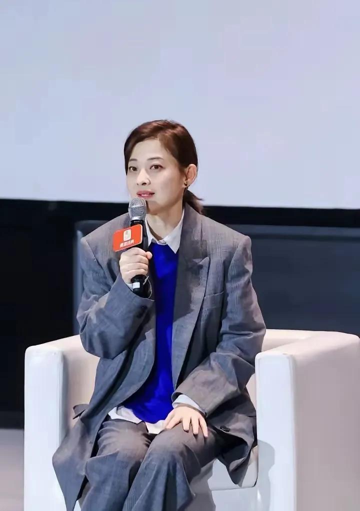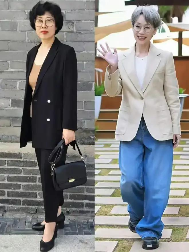 50 岁的梅婷她就很会穿衣打扮,用一套灰色的西服套装,内搭蓝色毛衣,叠穿白色衬衫,这样的色彩组合搭配既干练又高级,撞色的组合让造型更有层次感。