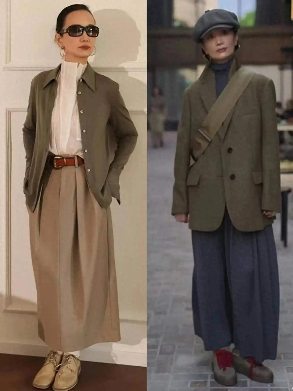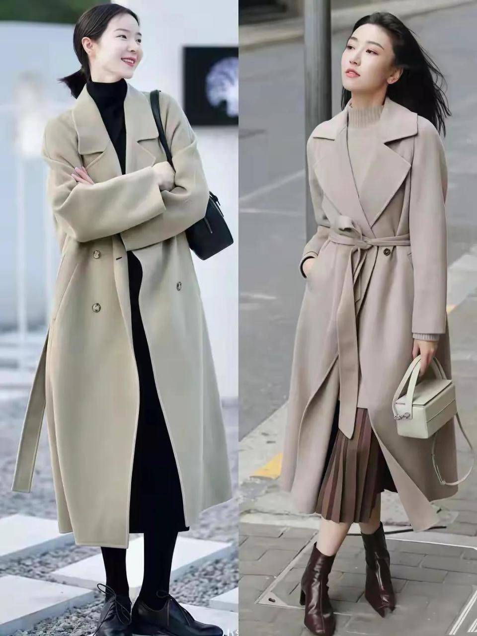当然了,穿衣打扮不光是颜色,衣服的版型也很关键,例如上面这两件驼色的大衣就有所不同,身材有点发福发胖的就要选廓形长大衣外套,会更遮肉显瘦。身材管理的比较好的,直接选择含有高腰瘦腰的大衣外套,更显气场。