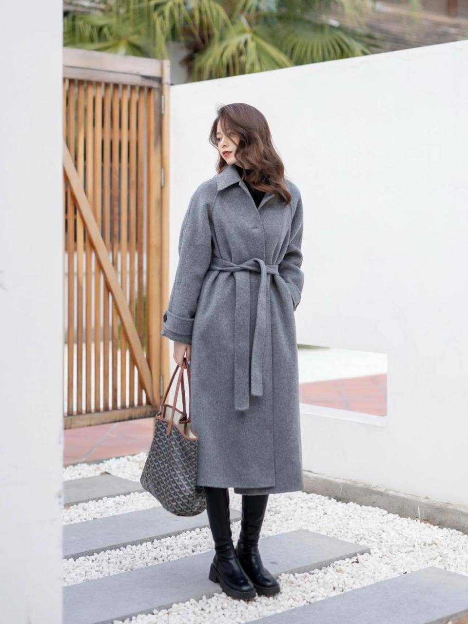 在这寒冷的冬季,性格内敛的女性我们可以用最简单的基础色组合,浅灰色 X 型大衣外套,内搭黑色毛衣,加上黑色的中筒靴,就能使得穿搭者变得非常的高级,时髦,干练。而且这一款大衣外套自带腰带,穿的时候系起来就能勒出小蛮腰,形成高腰线,让身材变成三七分,显高显瘦。