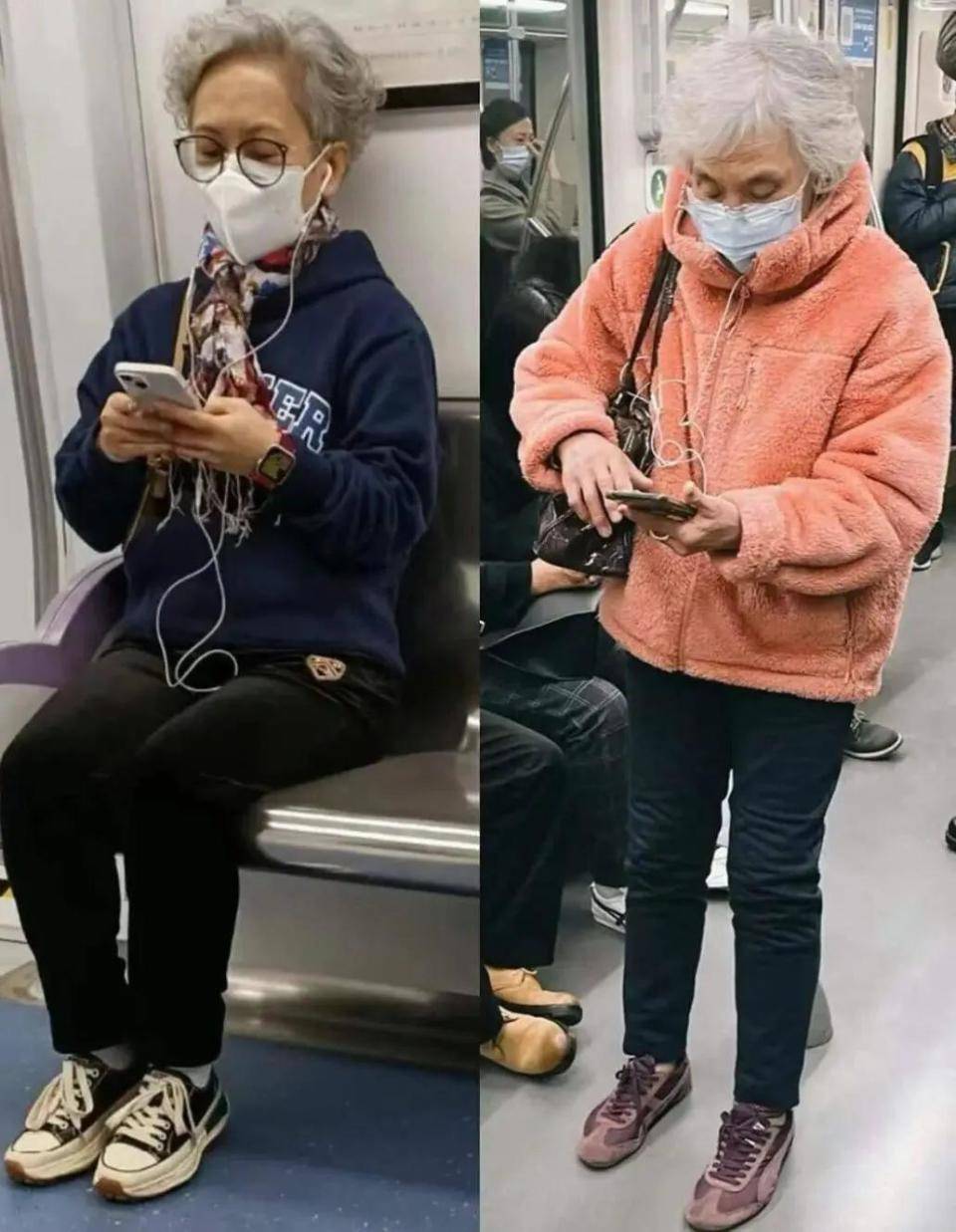 就好比上面用粉色的颗粒外套搭配黑色的收脚裤,脚上穿的紫色的德训鞋,这样的穿搭配色显得很凌乱,整体配色超过三个色调,而且有装嫩的嫌疑,并不符合中老年女性穿搭。
