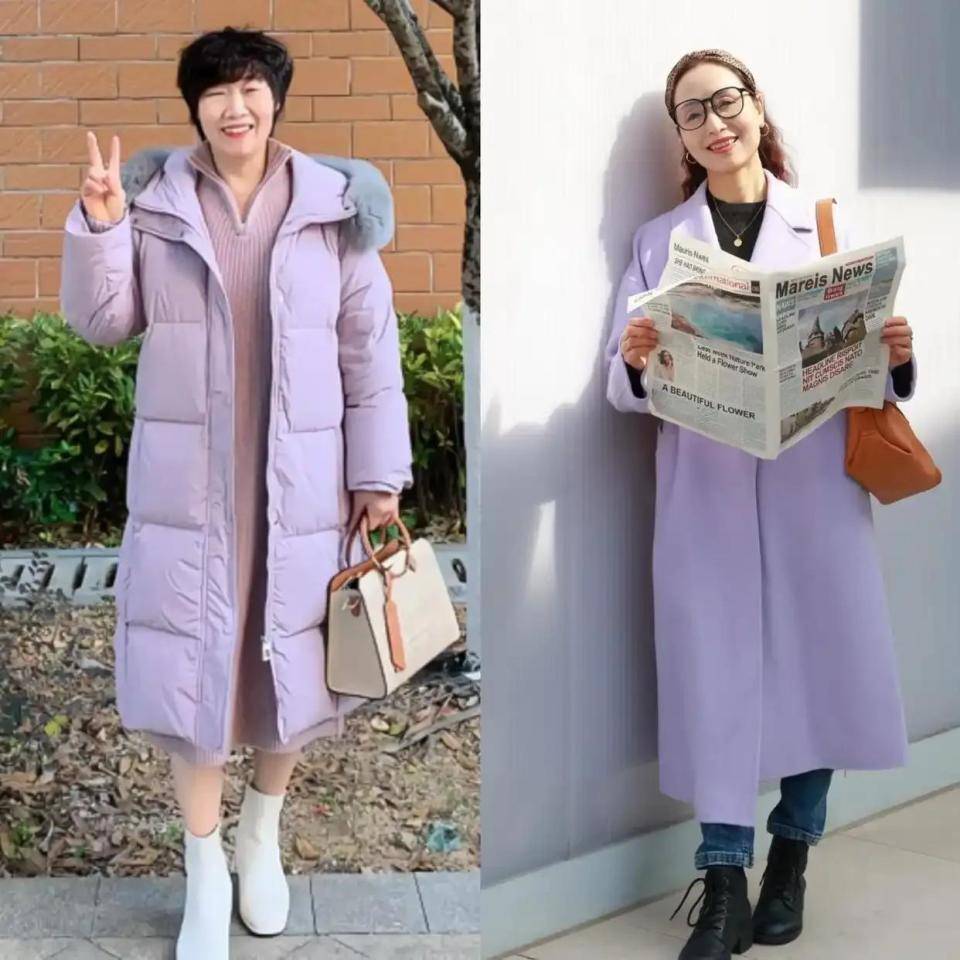 如果想要穿彩色的衣服,一定要选择浅色系,浅色系的衣服更不挑年龄,也不挑肤色。例如上面用浅紫色的羽绒服或者浅紫色的大衣穿在身上,都能使得穿搭者显白又减龄。